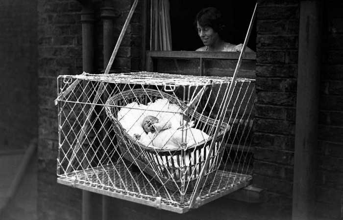 Один изобретатель в 1930-х годах подумал, что было бы неплохо садить своего ребенка в клетку и подвешивать его за окном, чтобы тот побыл на свежем воздухе. Подобные клетки продавали в рамках клуба Chelsea Baby Club в Лондоне для семей без сада возле дома и для семей, которые жили на верхних этажах высотных зданий.