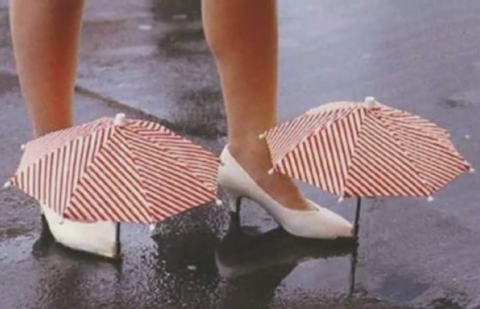 Иногда во время дождя очень не хочется намочить свою обувь. Что же делать… конечно же купить зонтики для туфель. Конечно, это не поможет против луж или брызг от автомобилей, но от дождя спасет. Но выглядит это, мягко говоря, странно.