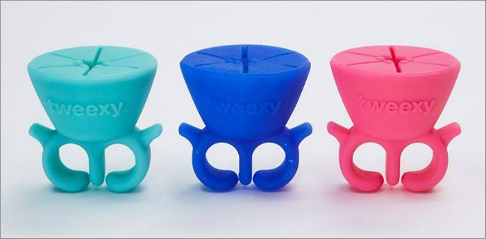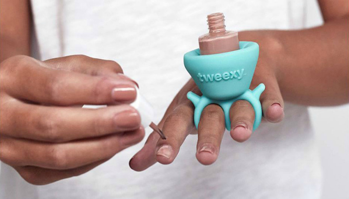 Есть «проблема», есть и решение. Лиз и Марк изобрели Tweexy – кольцо для идеального маникюра. Силиконовый аксессуар надевается на два пальца сразу. Его украшает крупный «камень», куда следует поместить флакончик лака.
